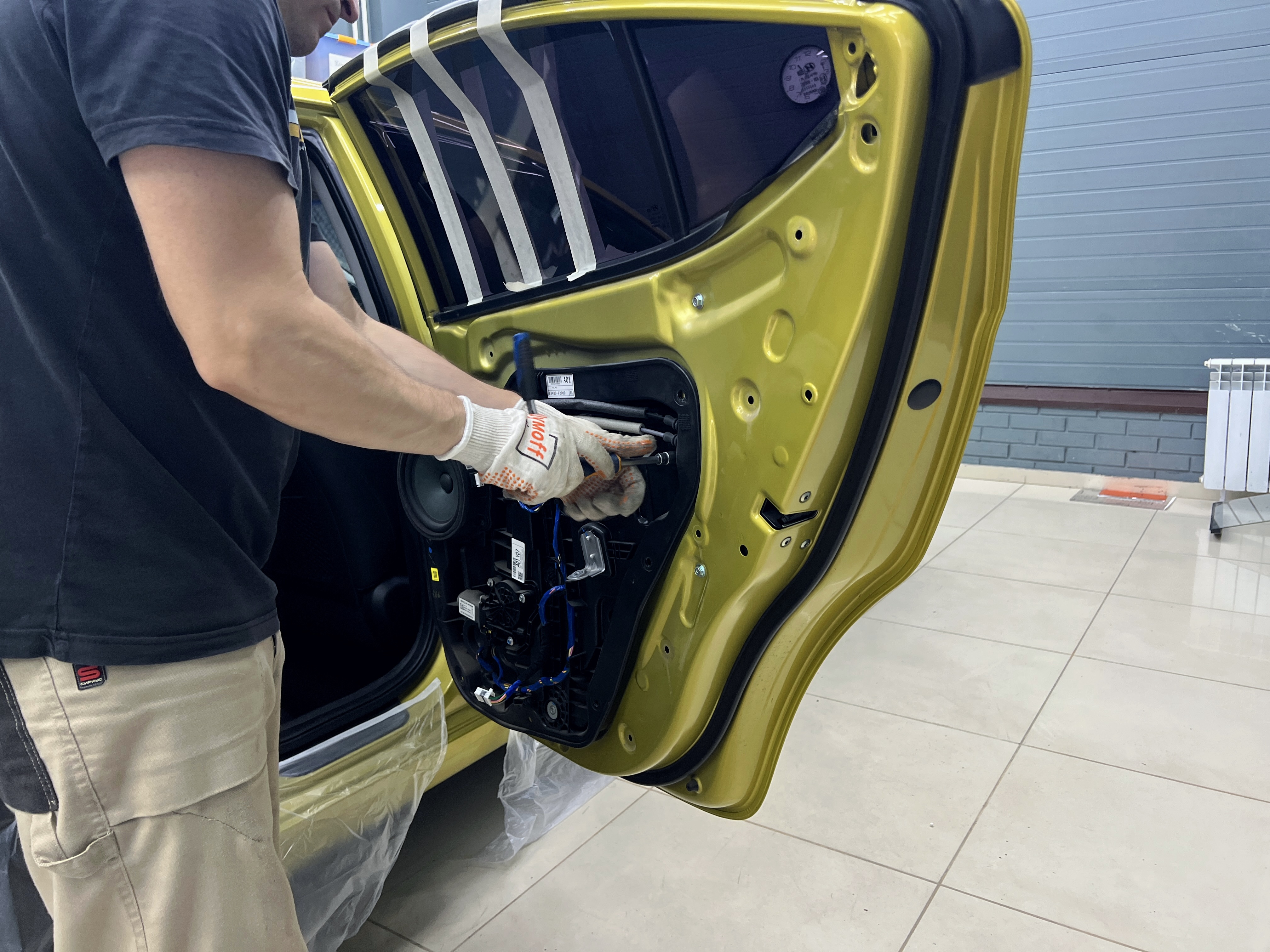 Приступаем к шумоизоляции дверей Hyundai Elantra (Хендай Элантра). Разбираем все дверные обшивки. Убираем их на специальный стеллаж, чтобы не повредить.