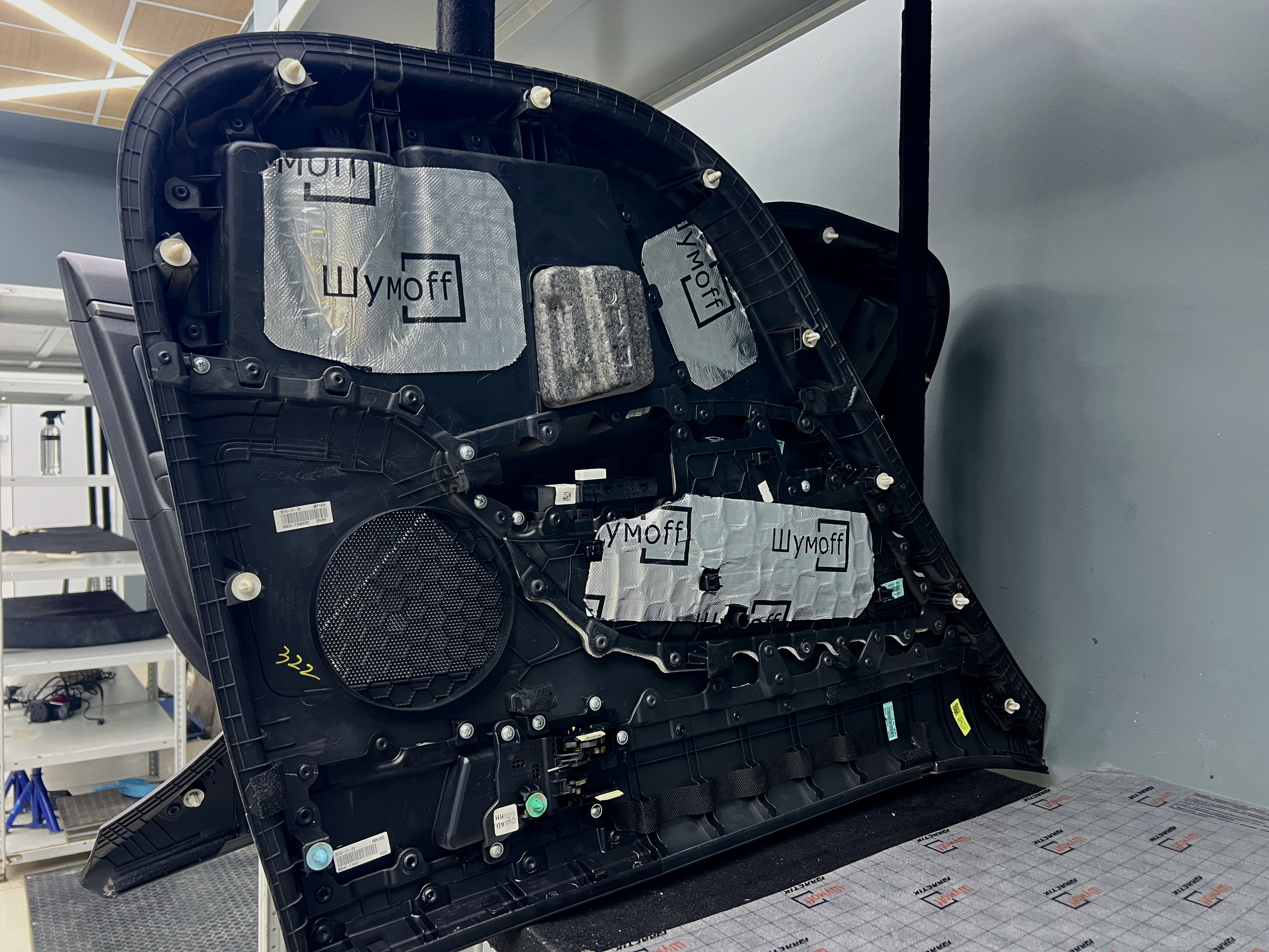 Переходим к оклейке самого корпуса панели, первым слоем частично наносим виброизоляцию Шумофф Joker, создавая тем самым идеальный баланс. Такая частичная оклейка позволит нам чрезмерно не утяжелять панель и придать ей необходимую сбитость
