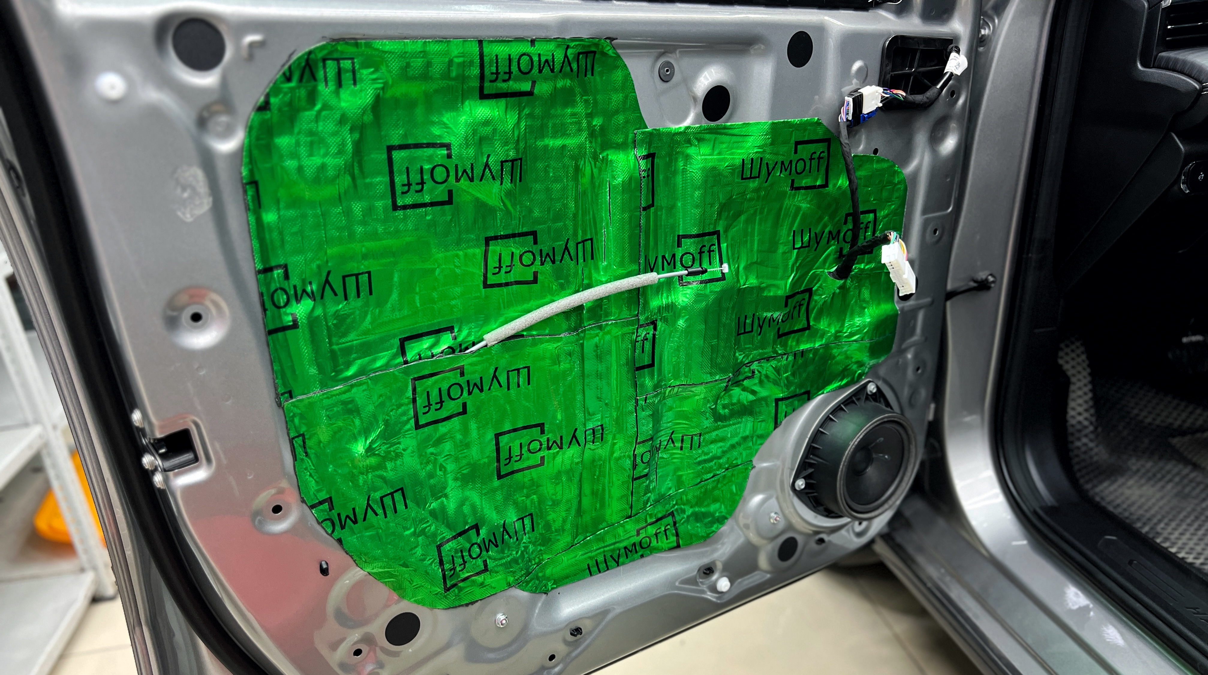 Виброизоляция дверей Хавэйл Джолион Первым слоем на внутреннюю часть двери клеим виброизоляцию Шумофф М2. Этот слой поможет нам улучшить звучание акустики, а также сделать закрывание дверей более приятным.